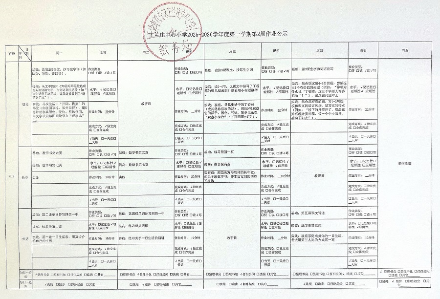 王兰庄中心小学2025-2026学年度第一学期第2周作业公示