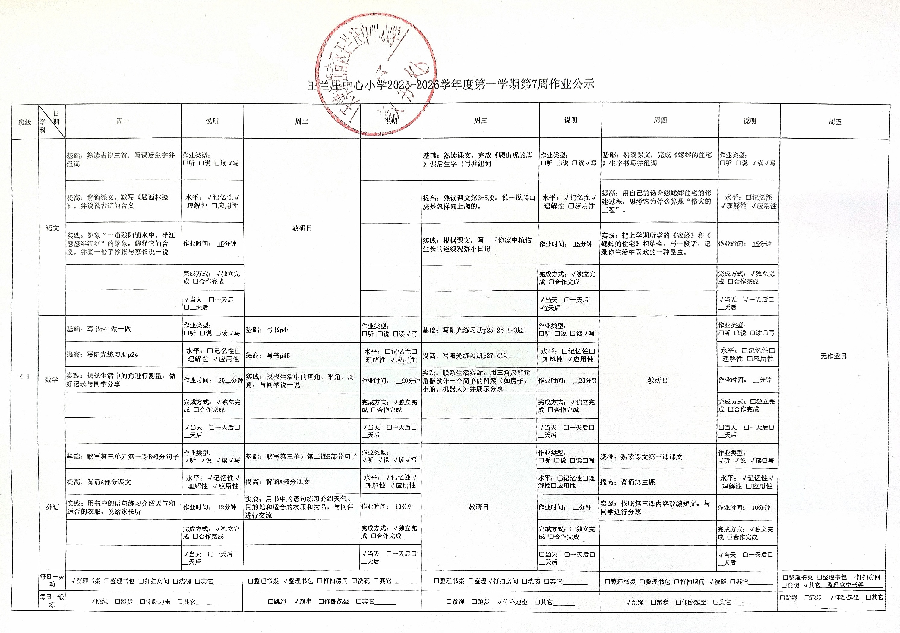 王兰庄中心小学2025-2026学年度第一学期第7周作业公示