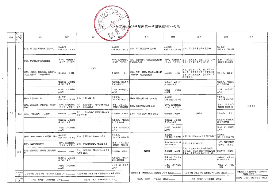 王兰庄中心小学2025-2026学年度第一学期第8周作业公示