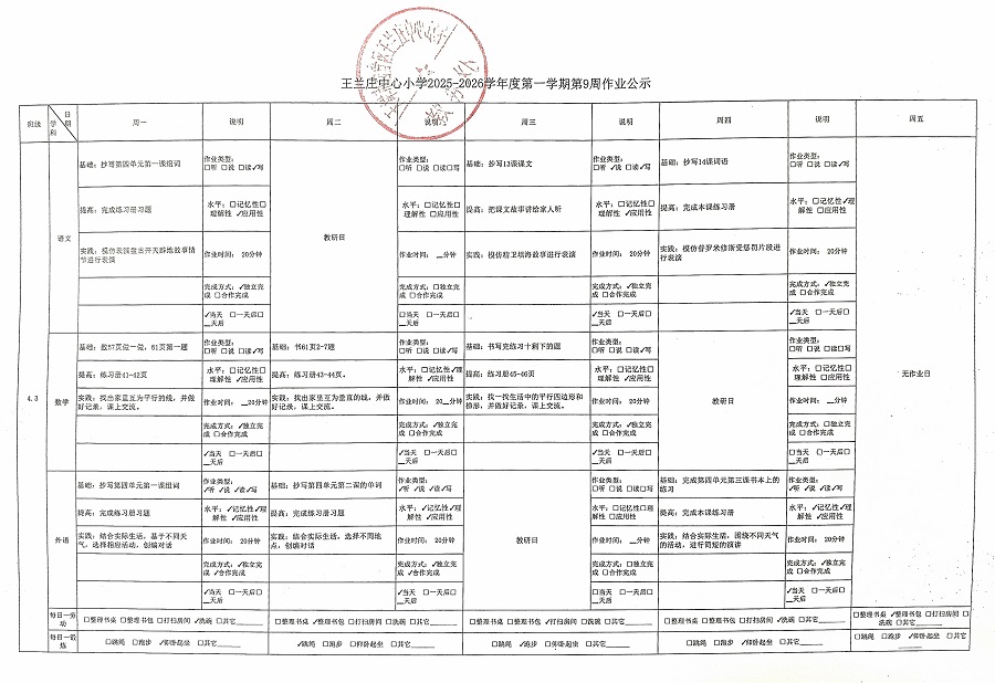 王兰庄中心小学2025-2026学年度第一学期第9周作业公示