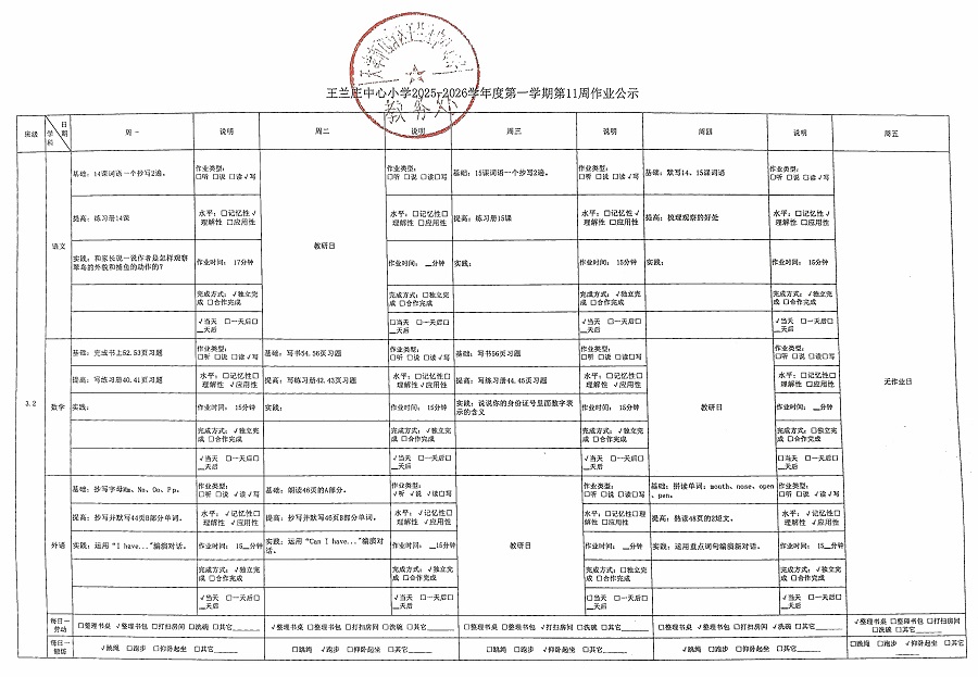 王兰庄中心小学2025-2026学年度第一学期第11周作业公示