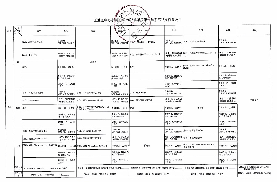 王兰庄中心小学2025-2026学年度第一学期第13周作业公示