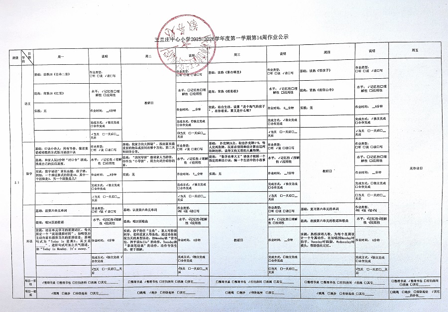 王兰庄中心小学2025-2026学年度第一学期第14周作业公示