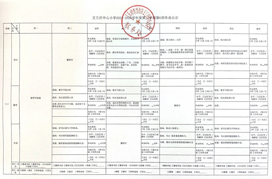 王兰庄中心小学2025-2026学年度第二学期第6周作业公示